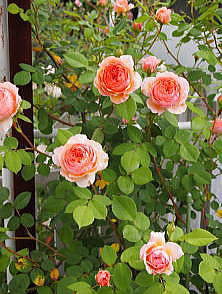 「アブラハムダービー」が次々と開花しました。 サーモン系の花びらは ちょっと豪華。 存在感があります。 やさしい蕾の「ヘリテージ」。 きれいな白色の「ジュネープリンセス」。 それから 昨年植えた 新しい 「ウイリアム モーリス」も沢山の蕾を付けています。 |